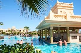 There are large swimming pools with sun loungers in the pool, and a bonus was having a bar in the swimming pool.